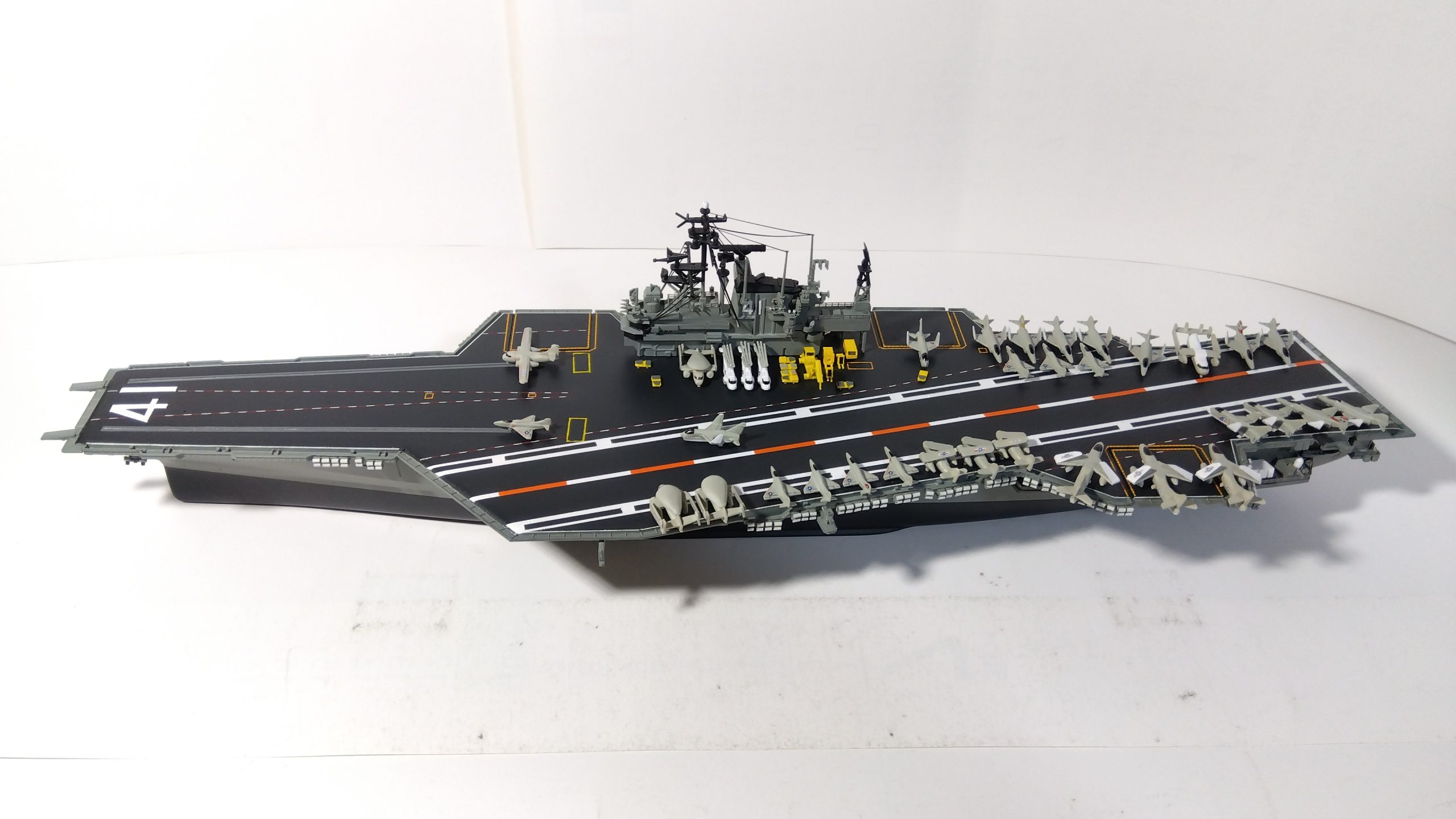 1/800スケールのミッドウェイのプラモデルを、1960年代頃の艦載機の配置をイメージして並べてみました。